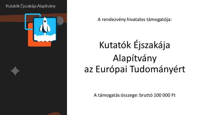 A 16 helyszínen zajló program megvalósítását a Kutatók Éjszakája Alapítvány az Európai Tudományért által kiírt pályázaton elnyert 100.000 forintos támogatás segítette, amely lehetővé tette, hogy iskolánk méltó módon kapcsolódjon be az országos Kutatók éjszakája programba.